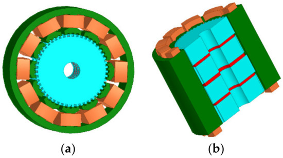 The 3D model of initial 3P-HSM: (a) 3D model of the 3P-HSM with 12 slots; (b) axial sectional view of the motor.