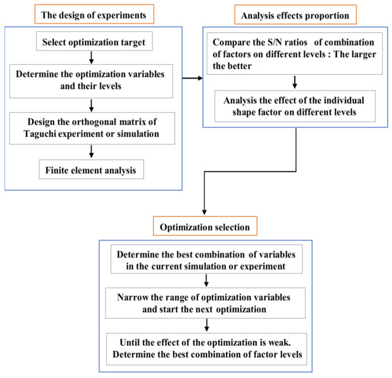 The Taguchi optimization algorithm, which is adept in the use of discrete results to identify the optimal point, has been widely used in many areas, e.g., national defense, chemical, and motor applications [23]. The orthogonal array (OA) and the signal-to-noise(S/N) ratio are the main tools used in this method [24,25,26]. The former was applied to design representative experiments and shorten the number of required hours. The latter was used to analyze the factors’ effect and determine the next optimization. Figure 8 shows the flowchart of the Taguchi optimization method.