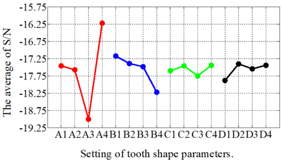 The combinations of signal-to-noise ratios, at different levels, for the four factors (A = rt1/rλ, B = st1/sλ, C = rθ, D = sθ) during the optimization process are shown in Table 4. The effect of each shape factor is reflected in Figure 9. It is clear that except that factor D had the least impact, the effect of each tooth shape factor was not significantly different. According to the average value of the S/N ratio, the best factor level combination can be judged as A1B3C4D3, where A1 = 0.15, B3 = 0.1, C4 = 15, and D3 = 60. After the first stage optimization, the THD of the THD-min 3P-HSM was reduced from 7.55% to 6.2% of the prototype’s initial 3P-HSM.