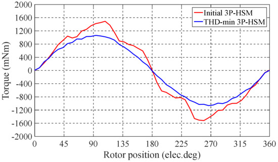 The optimal tooth geometry and the FE results of the 3P-HSMs are illustrated in Figure 11. Furthermore, the FE analysis results of the torque angle characteristic are shown in Figure 12. It is clear that the THD of the optimized HSM was significantly improved compared to the initial design.