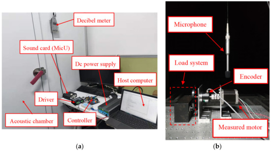 Noise testing of motors involves high requirements for the testing environment; thus, the motor noise tests carried out in this research were conducted in an acoustic chamber [30]. The chamber used multiple layers of grille fabric and multiple layers of damped acoustic composites to absorb the noise and prevent multiple sound reflections from occurring. A special damping spring was installed at the bottom of the acoustic chamber to prevent external ambient noise from entering the acoustic chamber and causing interference [31,32,33]. Table 7 shows the equipment used in the noise tests. In the test, the motor and microphone were installed in the acoustic chamber for noise measurement. The host computer drove the 3P-HSM with a sinusoidal current, and recorded motor noise information at different speeds. Then, waterfall analysis was used for vibration and noise analysis, which superimposed each speed in a graph to display the noise spectrum.