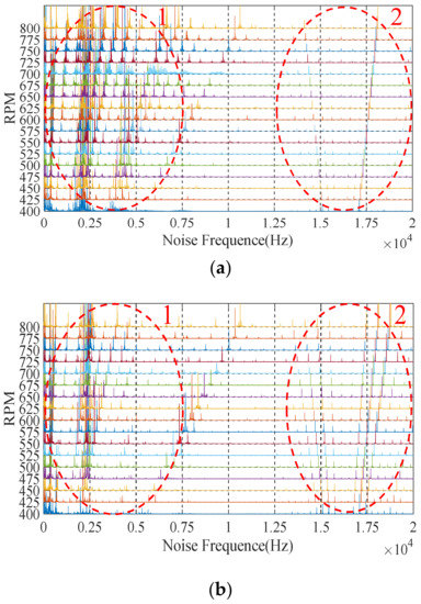 Additionally, in Figure 15, the noise at 15–20 kHz is shown to be caused by the chopping of the driver. Because the chopping frequency of the current was 16.2 KHz, the noise formed by the chopping was distributed in an umbrella shape centered at 16.2 KHz on the waterfall diagram. It appeared as a result of the modulation of the high frequency carrier signal and the low frequency modulating wave signal and was not related to the tooth shape of the motor; thus, it is not discussed in detail here.
