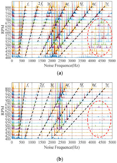 Complete noise waterfall: (a) initial 3P-HSM; (b) THD-min 3P-HSM.