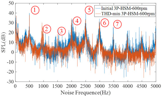 Compared with the initial prototype, the noise amplitude of THD-min 3P-HSM was significantly reduced, especially the reduction in the harmonic noise by 6 times, as well as the reduction in the higher harmonics, indicating that the torque ripple was improved in the optimized motor; this means that the optimization of the tooth shape was effective.