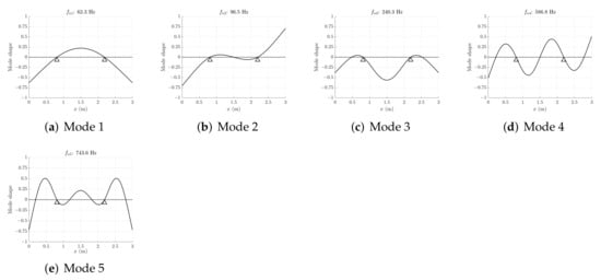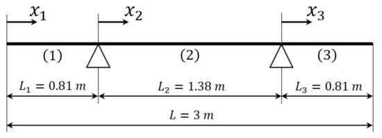 The natural frequencies and the modes of vibration are calculated with the method proposed in [20,21]. The continuous beam is divided into three parts with different coordinate systems and origins, see Figure 3. The deformed shape of the ith part of the beam, see Figure 3, is described by the function :