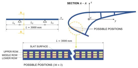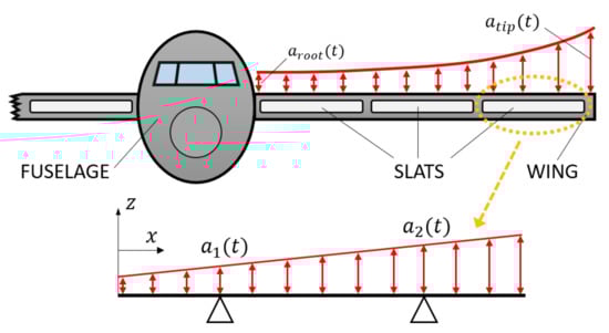 A scheme of a wing equipped with slats is depicted in Figure 5. The slat is mounted on the wing, and vibration acceleration amplitude increases from the root of the wing to the tip.