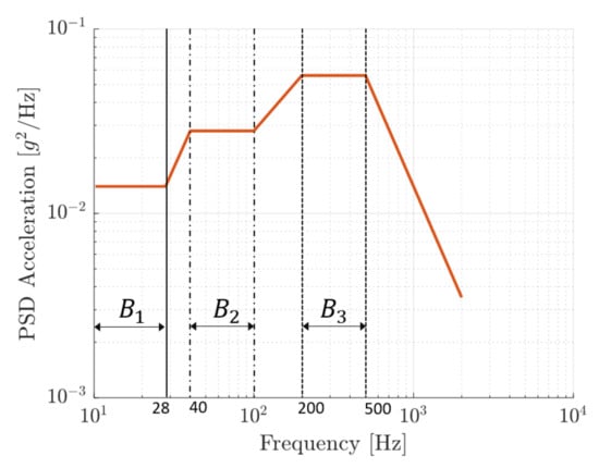 PSD of the acceleration based on the standard specification RTCA-DO-160 CAT S curve E [22]. Three characteristic frequency bands are defined and highlighted.