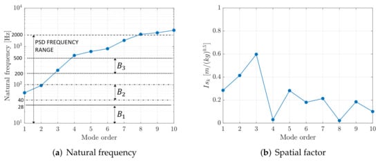 In practical simulations the summation is truncated, taking into account only the modes that are present in the frequency band of interest. Equation (31) shows that the deformed shape of the slat is the result of the contributions of the various modes of vibration, and that determines the relevance of each modal contribution. is large when the kth mode of vibration is excited at a frequency equal or close to the natural frequency of the mode; in this case, the denominator of Equation (30) is minimum. Figure 8a depicts the natural frequencies of the first ten modes of vibration of the slat in relation with the bands of the broad-band excitation (see Figure 7). It is clear that only the first five modes are significantly excited by the broad-band vibration, whereas the higher-order modes are poorly excited. Figure 8b shows values of factor and highlights that the third vibration mode has the largest matching between the mode shape and the symmetric load distribution, whereas the second mode is the most excited by the anti-symmetric load distribution.