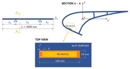 The sizes of the PE patch are much smaller than the sizes of the slat; hence, there are many positions where the PE patch can be attached to the slat’s surface. The power generated by the patch depends on the position, since the vibration level changes along the slat. The dependence of the generated power on the PE patch position is analyzed in Section 3.2. Figure 9 shows an example of PE patch attached to the slat’s surface and shows the local reference frame of the patch (axes 1, 2, 3) and the global reference frame (axes x, y, z). The patch is designed to exploit the axial strain of the substrate (1-direction) and is polarized in the direction perpendicular to its middle plane (3-direction, piezoelectric effect ). Therefore, the patch is oriented with its 1-axis parallel to the x-axis of the slat reference frame, since the most important deformation of the slat is the axial strain caused by the transverse load distribution. The electro-mechanical parameters of the patch are represented in Table 1.
