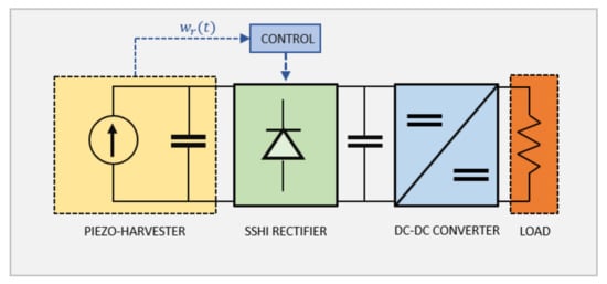 Piezoelectric energy harvesters provide an alternating voltage output, which is usually characterized by a predominant harmonic component. However, electronic devices typically require a DC voltage input. Therefore, piezoelectric energy generators are equipped with a power management unit (PMU), which uses an AC-DC voltage rectifier and a DC-DC converter for impedance matching with the connected electronic device. The scientific literature provides different PMU schemes for highly efficient energy conversion. The synchronized switch harvesting on inductor (SSHI) technique has shown the most promising results in boosting the performance of the energy generator [25,26]. Figure 10 represents a PMU based on a SSHI rectifier.