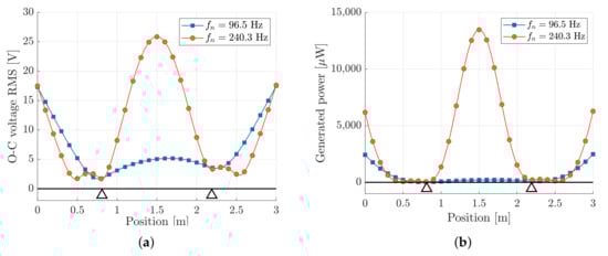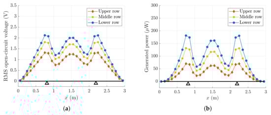 Figure 12a,b represent the RMS values of the OCV and the power output generated by a single PE patch, as a function of the position on the slat according to the grid of Figure 11. The voltage and power are calculated by means of Equations (40) and (43), respectively.