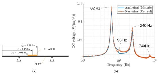 Figure 13b shows that the analytical and the numerical FRFs are in good agreement. The modes of vibration of the slat and the peak values are correctly described. The RMS value of the OCV generated by the patch in the FE model is estimated using Equations (39) and (40). It is worth noticing that the FRF in Equation (39) is calculated by means of the FE model. Table 2 compares the RMS value of the OCV calculated by means of the analytical and numerical model. There is a good agreement between the two values, and this corroborates the reliability of the analytical model presented in the previous sections.