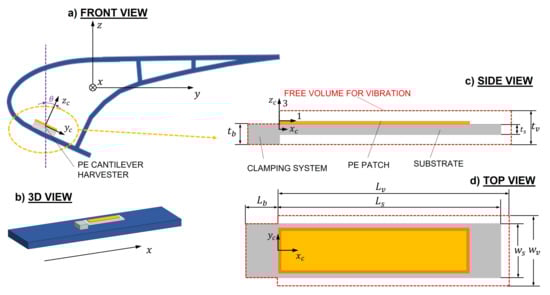 Example of PE cantilever harvester: (a) arrangement of the cantilever harvester; (b) the 3D view; (c) side view of the cantilever harvester and required free volume for vibration; (d) top view of cantilever harvester.