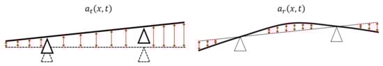 is the transverse displacement of any point along the beam caused by the motion of the supports. In general, the two supports have different displacements; therefore, they cause a translation and rotation of the un-deformed beam [9,19]. is the transverse motion of any point of the beam caused by elastic deformation (i.e., the relative motion with respect to the un-deformed beam). In Equation (1), the backward piezoelectric coupling term [9,19] is neglected, because the piezoelectric patches are much thinner and less stiff than the slat skin and because the length of the patches is much smaller than the total length of the slat. Free un-damped vibrations are described by the following homogeneous equation: