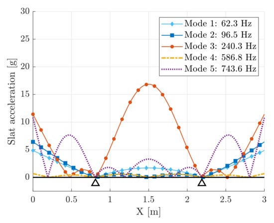 where is the mass-normalized mode, which is proportional to the non-normalized mode. Figure 4 shows the first modes of vibration of the slat and the corresponding natural frequencies. The first mode (fundamental mode) has a natural frequency of 62.3 Hz, whereas the fifth mode reaches a natural frequency of 743.6 Hz. The odd modes are symmetric with respect to the slat center, whereas the even modes are anti-symmetric.