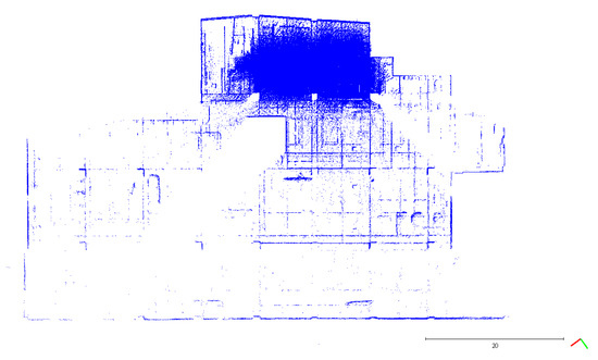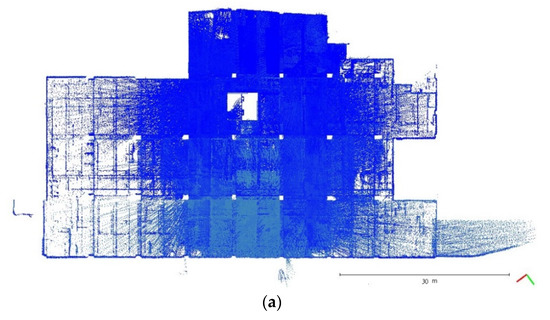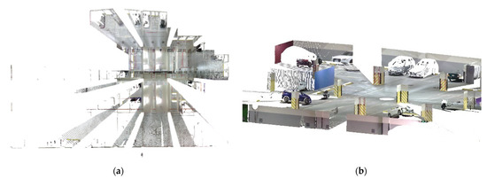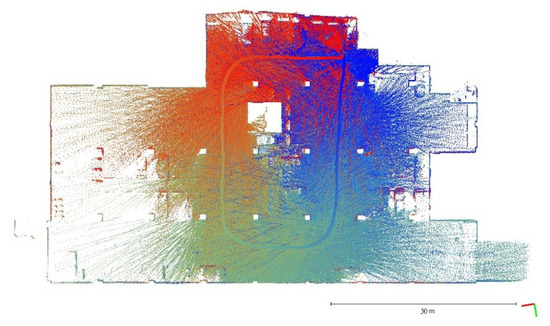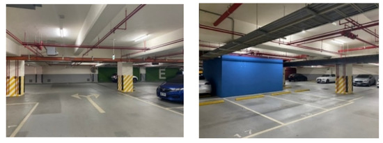 The size of the calibration site was about 35 m by 27 m by 3 m, located on the underground parking lot of the Research and Innovation–Incubation Center at National Chengchi University in Taiwan. The calibration site provided a large variety of planar features with different ranges for calibration, as shown in Figure 2.