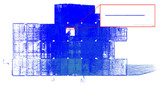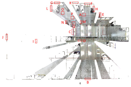 As mentioned in Section 2.2.1, a Faro ground-based LiDAR scanner was used to capture the point cloud of the calibration site in one station instead of multiple stations to avoid point cloud registration errors. The collected point cloud data are shown in Figure 3. Seventeen plane features labeled A to Q were manually extracted from the ground-based LiDAR point cloud for calibration reference data. The location of each plane is shown in Figure 4. The size of each plane was about 0.7 m by 1.2 m, and its planar parameter was determined by the least-squares method. The parameters and fitting RMSEs are shown in Table 3. All plane-fitting RMSEs were not greater than 0.001 m, indicating that the point cloud data of FARO Focus S350 was of a certain accuracy and reliability as the calibration planes and the check planes.