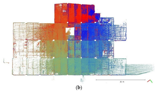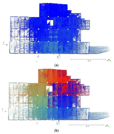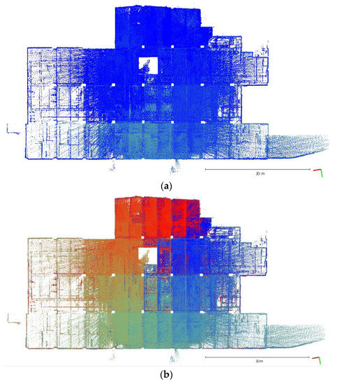 The top view of calibration dataset DATA2. (a) Point cloud colored by SLAM condition; (b) Point cloud colored by scanning time.