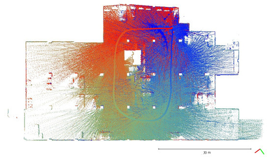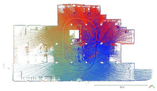 A plane-based dynamic calibration developed in the previous study [23] and mentioned in more detailed in Section 2.4 was performed to investigate the calibration results. Dynamic or kinematic calibration means capturing the point cloud data in a mobile manner for calibration. Compared to static calibration, dynamic calibration can obtain richer points with various ranging measurements, and there is no need to place the handheld LiDAR scanner in multiple stations to capture data separately, saving a lot of time [17]. For the tests in this study, three calibration datasets of the point cloud in the calibration field were obtained by the GeoSLAM ZEB Horizon. The relevant collected information was tabulated, as shown in Table 4. The scanning time for each dataset was approximately 85 sec, and the number of point clouds for each dataset was about 150,000,000 points. Figure 5, Figure 6 and Figure 7 show the collected datasets, and the colors in Figure 5a, Figure 6a and Figure 7a are determined based on the SLAM quality (SLAM condition). The best quality is blue (R = 0; G = 0; B = 255); the closer the datasets are to red, the worse the quality. In an indoor environment with rich features, the SLAM quality was obviously stable, and most of the point clouds were dark blue, indicating no significant problem in the SLAM solution or failure of the SLAM solution. The color of the point cloud in Figure 5b, Figure 6b and Figure 7b was given according to the scanning time, and the color of the point cloud gradually changed from red to blue according to the sequence of time; red was the scanning time of the beginning, and blue was the scanning time of the end. The scanning trajectory is shown in Figure 8, Figure 9 and Figure 10. The scanning path was planned as a walk around the center of the parking lot and close to the starting point at a normal walking speed to ensure that complete calibration data were scanned. The color-setting method of the trajectory was the same as in Figure 5b, Figure 6b and Figure 7b. It could be found that the starting point represented by red and the scanning end point represented by blue were close, which met the scanning requirements. Figure 8, Figure 9 and Figure 10 demonstaate the point cloud colored by scanning time and the scanning trajectory of dataset DATA1, DATA2, and DATA3.