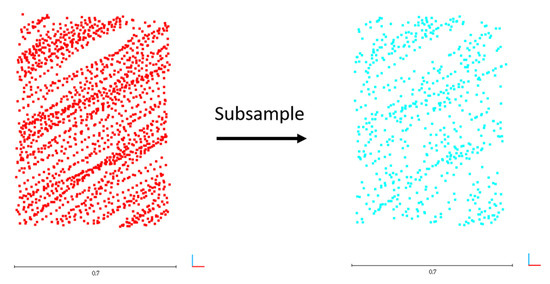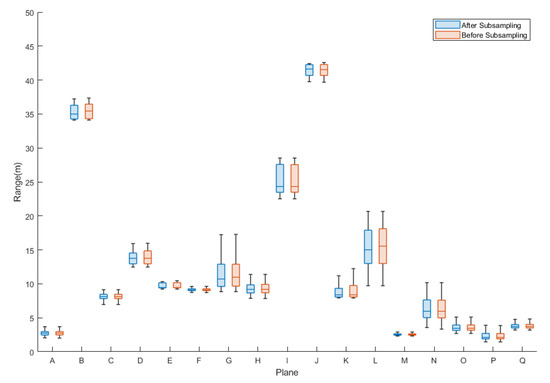 After the point cloud was filtered, the point clouds located on the calibration planes and check planes were manually extracted for the calibration data. In order to avoid the large difference in the point numbers on different planes and the excessive concentration in certain ranging measurements to affect the determination of the ranging system error parameters— including the range scale factor (S) and the rangefinder offset (C)—the same number of point clouds was randomly subsampled on each plane so that the calibration point data could be evenly collected in the various ranging measurements.