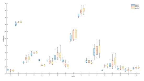 Box diagram of calculated pseudoranging measurements in each plane after subsampling and blunder removal by the RANSAC algorithm for datasets DATA1, DATA2, and DATA3.
