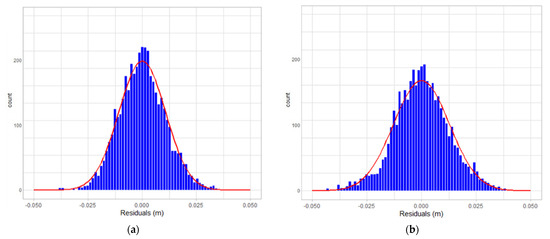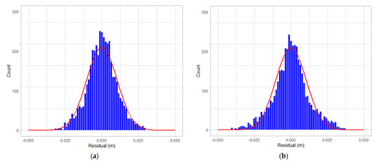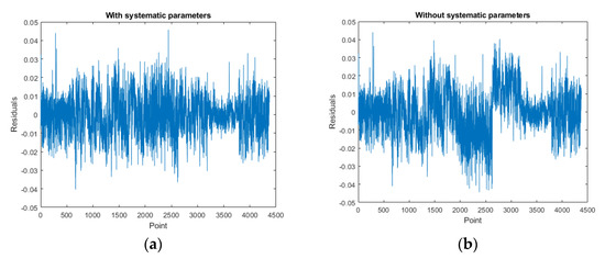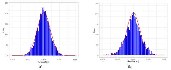 Figure 19, Figure 20 and Figure 21 are the residual distribution plots. Meanwhile, Figure 22, Figure 23 and Figure 24 show the residual scatter plots using the datasets DATA1, DATA2, and DATA3 after adjustment, with or without determination of the ranging system error, respectively. In particular, Figure 19a, Figure 20a and Figure 21a are the adjustment results’ residual distribution or residual scatter plots, by incorporating the ranging system error into the adjustment system as additional parameters (referred to with APs) together with the six rigid-body conversion parameters were regarded as the unknowns for determination simultaneously. Meanwhile, Figure 19b, Figure 20b and Figure 21b are the adjustment results’ residual distribution or residual scatter plots, without adding the ranging system error as the additional parameters (referred to without APs), and only the six rigid-body conversion parameters were retained as the unknowns for determination.