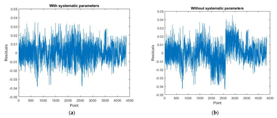 The residual distribution plots of dataset DATA2. (a) with Aps; (b) without Aps.