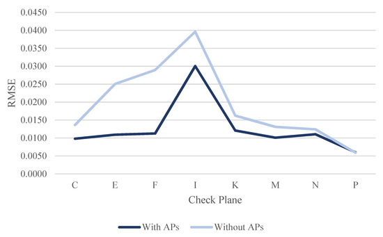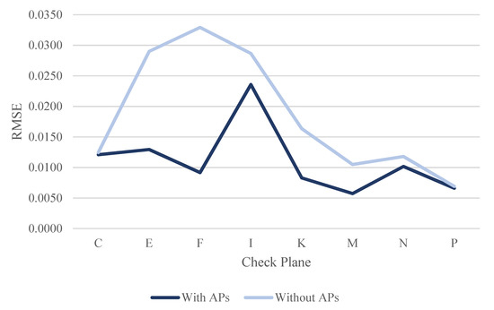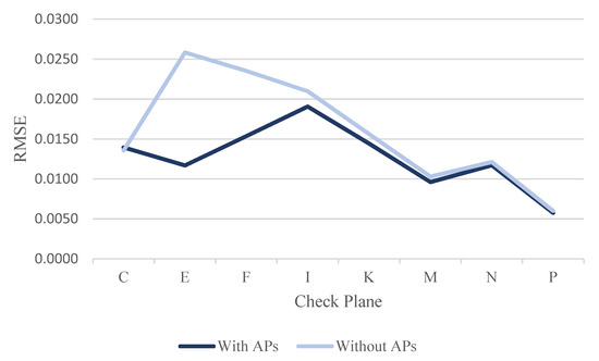 Table 12 and Table 13 show the RMSE results of the check planes, using the datasets DATA2 and DATA3 at different times on the same day. For the dataset DATA2, the RMSE of check plane P was not improved. However, the difference was only 0.0001 m. The RMSEs of the remaining 7 planes were improved after correcting the ranging system error (see the RMSE line chart of each check plane in Figure 26). With up to 61.08% in plane F, an increase of about 1.8 cm and an improvement of 1.4 cm in plane E were reached. The overall average improvement was 28.44%.