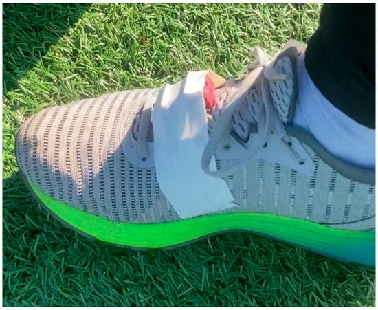 IMUs were secured on the instep of each shoe using a tight elastic band placed under the shoelaces and hooked over the clips of the IMU (Figure 1). The IMUs were further secured with an additional cross strap of sports tape. A stride was defined from touch-down of one foot to the subsequent touch-down of the same foot. The strides of both feet were analysed. Participants started from a split stance position with their front foot placed against the start line. The strides of this foot were denoted ‘front foot’ strides and that of the other, ’rear foot’ strides.