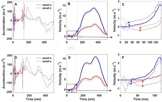 In the examples of Figure 2, the velocity offsets are indicated by two dots with additional arrows, in the panels on the right. The minimal ‘temporary’ velocity values indicated by the dots were used for zero velocity updating, which led to an up or downward shift of the velocity signals as described in the legend of Figure 2 and as indicated by the direction of the arrows (Figure 2C,F).