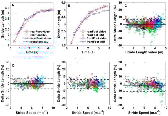 Typical examples of SL of both feet (rear foot at the start in red, front foot in blue) as a function of time for participant nos. 3 (A) and no. 9 (B) at 100% effort reaching maximal speeds of 9.17 and 8.95 m·s−1, respectively. Note that SLs from video (open circles) and IMUs (crosses) are very similar for both feet in (A), while in the other participant, the IMUs underestimated SL compared to the reference for the front foot only (B). (C) depicts the delta values (IMU–video) expressed as a percentage of video SL for all strides as a function of the video reference. Each symbol represents the data of a single participant. Delta values from sprints executed at 60, 80, and 100% effort, respectively, are shown (D–F) as a function of stride speed. Note that already at 60% effort, most strides were executed at a speed >5 m·s−1. The continuous lines represent the biases and the dashed lines, the limits of agreement.