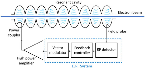 Particle accelerators utilize EM field for accelerating charged particles (e.g., electrons) in narrowband (e.g., 300 Hz bandwidth) resonant cavities with fundamental frequencies ranging from tens of MHz to several GHz, depending on the type of cavity and the final application [14,15,16,17]. The electric component of the EM field with given amplitude and phase interacts inside the cavity with the charged particles which, in turn, get accelerated (or decelerated, depending on the phase). Indeed, a precise control of amplitude and phase of the EM field inside the cavity is of primary importance to maximize acceleration. The accurate control of the EM field involves the calibration of its amplitude and phase as well as ensuring field stability throughout the acceleration process. Several external factors including charge fluctuations, microphonics, or de-tuning due to the Lorenz force [18,19] can disturb the field during operation.