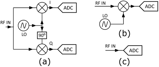 Block diagrams of typical IQ detection schemes: (a) analogue IQ demodulation via a quadrature demodulator; (b) digital IQ demodulation with analogue downconversion; (c) digital IQ demodulation with direct sampling.