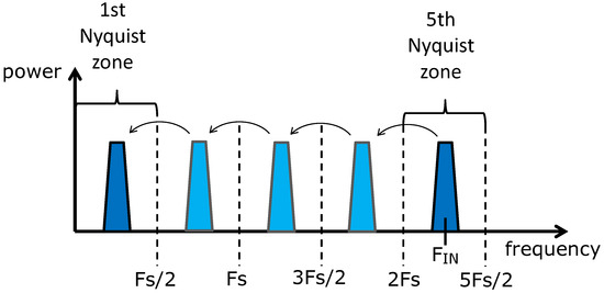 Due to the developments in ADC technology, nowadays it is possible to perform direct sampling of RF signals in the GHz range without analogue downconversion, as shown in the Figure 2c. Fast (≥400 MSa/s), high-bandwidth (≥1 GHz), and high-resolution (≥14 bits) ADCs are available for this purpose [11,28]. However, in many implementations, the sampling frequency () of the ADC is substantially lower than the fundamental frequency of the modulated input signal, so that the latter must be sub-sampled in the higher Nyquist Zones (NZs) and aliased back to the first NZ to allow for acquisition, as depicted in Figure 3. In practice, sub-sampling results in a direct digital downconversion bypassing the use of an analogue mixer, hence removing its distortion effects. Moreover, fast ADCs allows for larger processing gain available in a given time-slot due to the higher . However, directly sampling high input frequencies implies higher ADC noise due to clock jitter which is, in turn, subject to more demanding specifications in order to allow for the sufficient stability required by RF detection in linear accelerators.