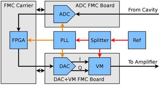 The output of the controller is then fed to a signal actuator, which is used to modulate a low-phase-noise reference RF signal. The actuator is most commonly an IQ modulator driven by two digital-to-analogue converters (DACs) for the I and Q signals, respectively. However, direct digital synthesis (DDS) of the digitally modulated signal is also possible, and it has been used in some lower frequency systems, e.g., in the 80–200 MHz range [22,23].