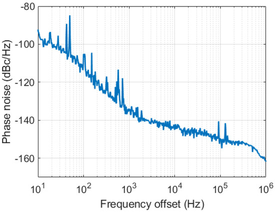 The phase noise characteristic of the RF source (Rohde and Schwarz SMA100B RF signal generator) used in the experimental tests as a fundamental reference was preliminarily characterized using the Agilent E5052B signal source analyzer (SSA), as shown in Figure 5. The jitter [33] of the reference signal, integrated in the 10 Hz–1 MHz band, resulted in 17.46 fs rms.