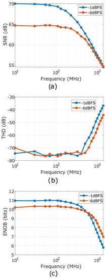 Metrological characterization of the RF detector at input amplitudes of −1 and −6 dBFS: (a) signal-to-noise ratio; (b) total harmonic distortion; (c) effective number of bits.