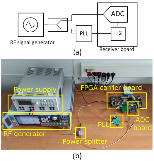 The measurement set-up implemented for such an assessment is shown in Figure 8. A 1.3-GHz CW RF signal is generated by the Rohde and Schwarz SMA100B, then split by a power splitter (Mini-Circuits ZFRSC-42-S+) into two channels. The first channel allows to directly feed the input of the detector board, while the second channel is used as a reference to derive a synchronous sampling clock by means of a PLL (TI LMX2582) with an integrated voltage-controlled oscillator (VCO).