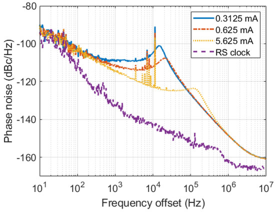 The loop filter bandwidth of the PLL was modified across the experiments by changing the charge-pump current in order to examine the impact of the sampling clock phase noise on the amplitude and phase stability performance of the detector. To this aim, the phase noise of the clock signal was characterized using a SSA (Agilent E5052B) for three values of the charge pump current, namely, 0.3125, 0.625 and 5.625 mA, the latter of which was found to provide optimal loop bandwidth. Figure 9 shows the phase noise performance for the 800 MHz case in the three configurations, as well as the reference clock for comparison purposes. The integrated jitter in the range from 10 Hz to 10 MHz was found to be 279.9 fs, 186.5 fs, and 95.5 fs, respectively, whereas it was 23.66 fs for the reference clock.