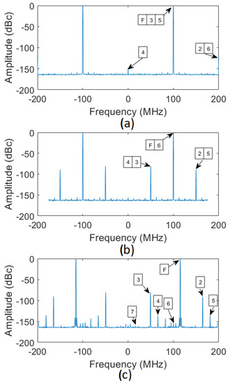 FFT of the of the acquired 1.3 GHz signal before digital demodulation (a) sampled at = 400 MSa/s (IQ sampling); (b) sampled at = 350 MSa/s (non-IQ sampling); (c) sampled at = 394.9367 MSa/s (non-IQ sampling). Labels indicate the harmonic order for each spectral line.