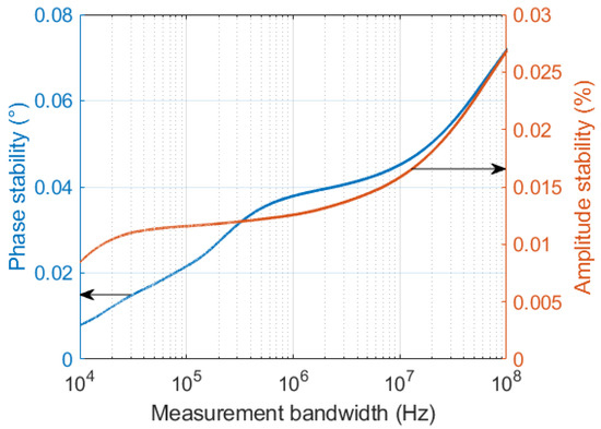 Figure 11 shows the dependency of the stability metrics against the measurement bandwidth in the case of PLL charge-pump current of 5.625 mA, which corresponds to the lowest jitter. In particular, the plot shows the highest rate of change of the phase stability metric at measurement bandwidths narrower than 1 MHz. This behaviour can be interpreted considering that the phase noise of the sampling clock is convoluted with the input tone in the sampling process, whereas wideband noise in the acquisition is uniformly distributed across frequency, so that the former dominates the stability behavior in the narrow bandwidth around the demodulated input tone.