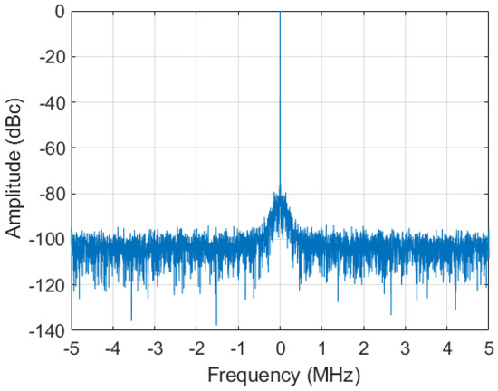 This can also be observed by evaluating the 131,072-point FFT of the demodulated signal in Figure 13. The spectrum is shown in a range from −5 MHz to 5 MHz, and the typical power spectral density (PSD) profile of the phase noise can be noticed in a bandwidth from −0.5 to 0.5 MHz around the demodulated input tone. These results demonstrate the dominant impact of the clock signal phase noise on the achievable phase stability in an LLRF system.