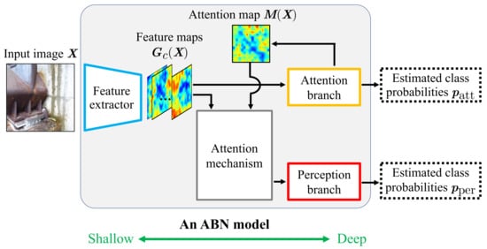 Based on convolutional neural networks (CNNs) [], the performance in various image recognition tasks has been improved []. However, general CNNs for estimation tasks output only the estimated class probabilities and do not explain the estimation results. Because misjudgment of the deterioration levels may endanger people using the infrastructure, high reliability is required. When engineers refer to the results of deterioration level estimation, trusting the estimation results that have unknown reasons is difficult. Therefore, methods that can explain the reasons for the estimation results are required. Recently, several methods have been proposed to improve estimation performance and interpretability using attention, which enables focusing on important features [,]. In image recognition, an attention branch network (ABN), which uses an attention map generated during the CNN-based estimation to improve estimation performance and explain the estimation results, has been proposed []. ABN has been used in various fields, such as self-driving, deterioration level estimation, and control of household service robots [,,,]. Figure 1 shows an overview of ABN. The ABN model has a feature extractor in the shallow part near the input and two branches called an attention branch and a perception branch in the deep part near the output. The attention branch performs estimation before the perception branch using feature maps output from the feature extractor. It also generates an attention map that represents the regions of interest in the estimation. The generated attention map is used to highlight important regions in the feature maps in the attention mechanism. The perception branch performs the final estimation using the feature maps that are output from the attention mechanism. The attention map is a spatial annotation that enables focusing on the important regions in the feature maps. However, the estimation performance is degraded when the actual regions of distresses are different from the regions highlighted by the attention map []. The influence of the attention map that does not highlight important regions needs to be reduced based on the reliability of whether the regions highlighted by the attention map are actual regions of distresses. Recently, several studies have reported on the use of attention by considering its reliability [,]. For example, the literature [] has reported the effectiveness of using only useful attention by considering the relationship between attention and query in image captioning. Moreover, it has been reported in [] that it is effective to use the attention that introduces the concept of uncertainty using a Bayesian framework for disease risk prediction. Moreover, the literature [] has reported the effectiveness of learning using data with “noisy labels”, which are labels with uncertain reliability, while considering the confidence in the labels. Therefore, in the ABN-based estimation, it can be more effective to reduce the influence of highlighted regions that are irrelevant to the actual distress regions. In other words, it is expected that the performance of the deterioration level estimation can be improved by preferentially utilizing an attention map that highlights regions related to the distress.