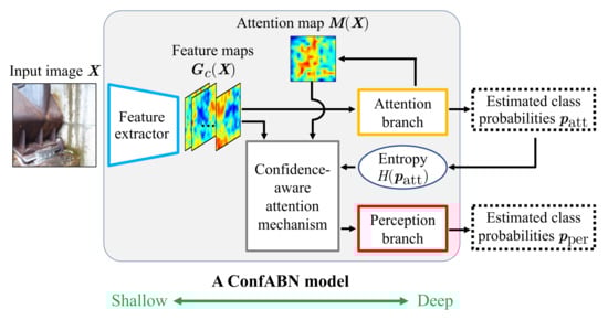 In this section, the estimation of deterioration level based on ConfABN is explained. As shown in Figure 2, ConfABN consists of three modules: a feature extractor, an attention branch, and a perception branch. The feature extractor is constructed with convolutional layers and calculates feature maps ( being the number of channels of the feature maps) from an input distress image . By using the feature maps , the attention branch outputs an attention map and estimated class probabilities used to train the ConfABN model. Then we calculate improved feature maps based on the confidence-aware attention mechanism from the feature maps and the attention map . The perception branch outputs the final estimated class probabilities using the improved feature maps . It is worth noting that the feature extractor, attention branch, and perception branch are constructed by partitioning the CNN model commonly used in general classification tasks, such as ResNet [], which is described in detail in []. In Section 2.1, Section 2.2 and Section 2.3, we explain the attention branch, confidence-aware attention mechanism, and perception branch, respectively. Furthermore, Section 2.4 describes the training of ConfABN.
