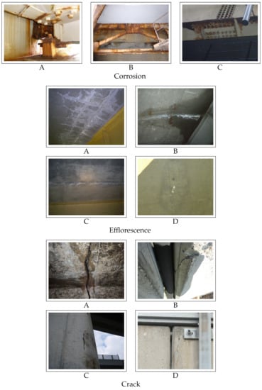 In the experiment, we used three datasets consisting of distress images of road infrastructure provided by East Nippon Expressway Company Limited. These datasets consist of images of corrosion, efflorescence, and crack. They are the most important distresses and are often used in previous studies [,,,]. The deterioration levels of corrosion to be estimated were “A”, “B”, and “C” in descending order of the risk. Moreover, the deterioration levels of efflorescence and crack to be estimated were “A”, “B”, “C”, and “D”. These deterioration levels are explained in detail in []. Examples of each type of distresses are shown in Figure 3. The datasets of corrosion, efflorescence, and crack consist of 6865, 5184, and 9982 distress images, respectively. The detailed numbers of images used in training, validation, and test for each level are shown in Table 1, Table 2 and Table 3. The value of in Equation (8) was experimentally set to 1. To evaluate the estimation performance, we used Accuracy and F-measure, which is the metric calculated as the harmonic mean of Recall and Precision defined as follows: