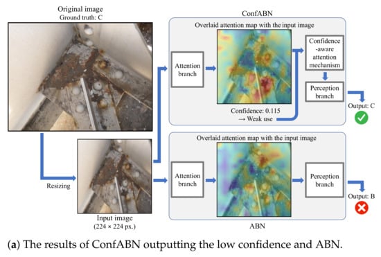 First, we discuss the examples of the estimation results of corrosion in Figure 4. Figure 4a shows the attention maps of ConfABN and ABN for estimating the deterioration level of the corrosion image with the ground truth of “C”, the confidence in the attention map of ConfABN, and the estimation results of ConfABN and ABN. In the input image, corrosion can be seen in the brown regions from the center to the top. However, since the attention maps of ConfABN and ABN highlight only a part of the corrosion region, they are ineffective. ConfABN estimates the low confidence in the attention map and reduces its influence. Then, it can output the correct estimation result. However, since ABN cannot consider the confidence in the attention map, it uses the ineffective attention map for the estimation and outputs the incorrect estimation result. Figure 4b shows an example of estimating the deterioration level of a corrosion image with the ground truth of “B”. In the input image, corrosion can be seen in the brown regions of the plate from the upper left to the lower right. Further, it can be seen in the brown regions of the root of the metal base. Since the attention map of ConfABN highlights the entire regions of corrosion, the attention map is effective for estimating the deterioration level. The attention map is strongly used in the perception branch due to the high confidence in the attention map of ConfABN. Thus, ConfABN succeeds in outputting the correct deterioration level. In contrast, although the attention map of ABN highlights most of the corrosion regions, it does not highlight some regions of corrosion. Thus, ABN outputs the incorrect deterioration level.