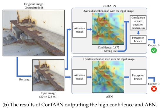 Next, we discuss the examples of the estimation results of efflorescence in Figure 5. Figure 5a shows an example of estimating the deterioration level of an efflorescence image with the ground truth of “A”. In the input image, efflorescence is revealed as a white line-like part in the center. The regions highlighted by the attention map of ConfABN do not include efflorescence. The attention map of ABN is fuzzy, and the highlight on efflorescence is weak. Since ConfABN can reduce the influence of the ineffective attention map, the perception branch of ConfABN observed the entire image again without focusing on the regions unrelated to efflorescence, and finally output the correct estimation result. However, ABN outputs the incorrect estimation result by focusing on the regions unrelated to efflorescence highlighted by the ineffective attention map. Figure 5b shows another example with the ground truth of “B”. As shown in the original image, efflorescence can be seen vertically in the center of the image. The attention map of ConfABN successfully highlights the regions of efflorescence; it also highlights the unrelated regions. The attention map is useful for estimating the deterioration level since the regions highlighted by the attention map include almost all efflorescence regions. However, trusting such an attention map entirely may lead to an incorrect estimation result. Meanwhile, ConfABN can appropriately handle this situation. The confidence in the attention map is lower than , suggesting that ConfABN does not have strong confidence in the attention map, including regions unrelated to efflorescence. The confidence-aware attention mechanism highlights the feature maps slightly more strongly using the attention map, including efflorescence-related and unrelated regions, and ConfABN outputs the correct deterioration level.