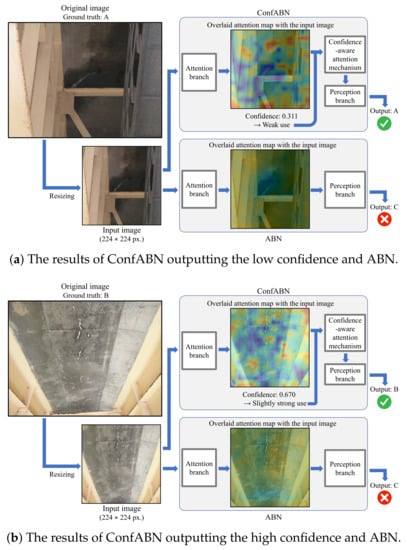 where and are the losses calculated by inputting and into the cross-entropy loss function, respectively. is 1 if class n is equal to the ground truth and 0 otherwise; is a hyperparameter for adjusting the influence of . The end-to-end training of the feature extractor, attention branch, and perception branch can be performed using the loss function L. In other words, training ConfABN with L realizes simultaneous optimization of the parameters of the model for the attention map generation and final deterioration level estimation.