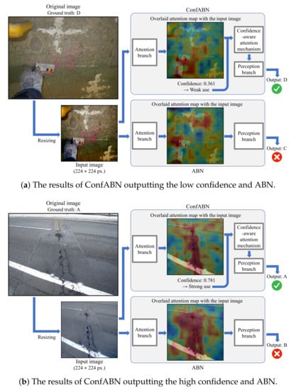 Finally, we discuss the examples of the estimation results of the crack in Figure 6. Figure 6a shows an example of estimating the deterioration level of a crack image with the ground truth of “D”. Since the crack is small and thin, the attention maps of ConfABN and ABN fail to highlight the region of the crack. ConfABN achieves correct estimation by utilizing the low confidence to reduce the effect of ineffective attention maps. Figure 6b shows an example of estimating the deterioration level of a crack image with the ground truth “A”. The cracks appear vertically from the center to the bottom of the input image. The attention map of ConfABN focuses on the region of the cracks, and the high confidence shows that the attention map should be strongly used. Consequently, ConfABN outputs the correct estimation result.