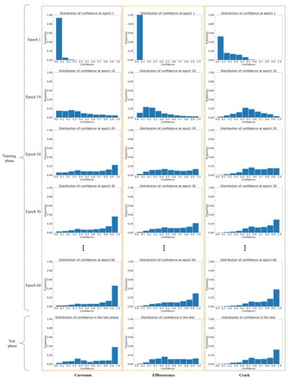 First, we describe the distribution of confidence during the training and test phases. Then, we discuss the effectiveness of using confidence in attention maps. Figure 7 shows the distributions of the confidence at the first, tenth, twentieth, thirtieth, and sixtieth epochs of the training and test phases for the three types of distresses. In epoch 1, i.e., at the beginning of the training phase, the confidence values in the attention maps are usually less than for all types of distress. In the general ABN, the large influence of the attention map from the beginning of the training phase is likely to make the region of interest in the perception branch narrow and ineffective for the estimation. However, ConfABN solves this problem by weakening the influence of attention maps at the beginning of the training phase. Furthermore, the results in epochs 10, 20, 30, and 60 show a gradual increase in the high confidence in the attention maps as the training progresses. Although the results in epoch 60 show a high proportion of confidence close to 1.0 in the later training phase, there is still low confidence. The proportion of low confidence in the test phase is higher than in epoch 60. Such low confidence indicates the existence of ineffective attention maps even in the later training and test phases, indicating the effectiveness of considering confidence in such situations.